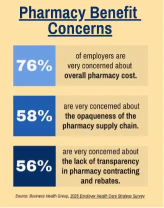 According to the Business Health Group’s 2025 Employer Health Care Strategy Report, 76% of employers are very concerned about rising pharmacy costs. More than half also worry about the lack of transparency in the pharmacy supply chain (58%) and in contracting and rebates (56%).